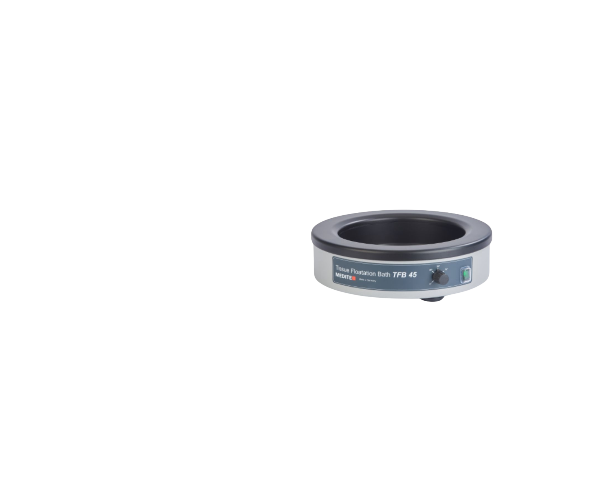 Det runde vandbad TFB 45 er et kompakt varmt vandbad med en pulverlakeret aluminium overflade og med en kapacitet på 1,5 liter. Ideelt til paraffinsnit som skal strækkes og fiskes op på objektglasset.